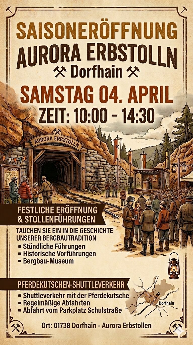 Von Anfang April bis Ende Oktober öffnen die Kumpel jeden Sonnabend von 10 bis 14.30 Uhr ihr kleines Erzbergwerk für interessierte Besucher. Ausgerüstet mit Schutzumhang, Helm und Lampe können Groß und Klein in einer ca. 35minütigen Führung die historische Welt des Bergmannes kennen lernen. Interesse geweckt www.auroraerbstolln-dorfhain.de